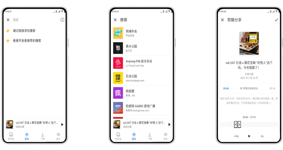 也可以直接导入软件里提供的在线订阅源,导入之后,你就可以收听电台了,播放界面,你可以进行下载、裁剪分享、查看介绍、还可以增强人声。