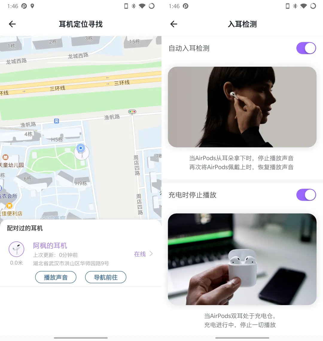 耳机不见了可以定位寻找,如果在家找不到了还可以播放声音来定位,虽然这些功能在安卓部分机型适配的耳机上也不稀奇,但在手机和耳机不匹配情况下能实现这些功能,还是挺让我感到惊艳。