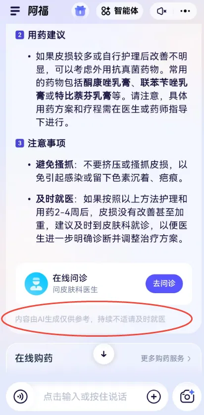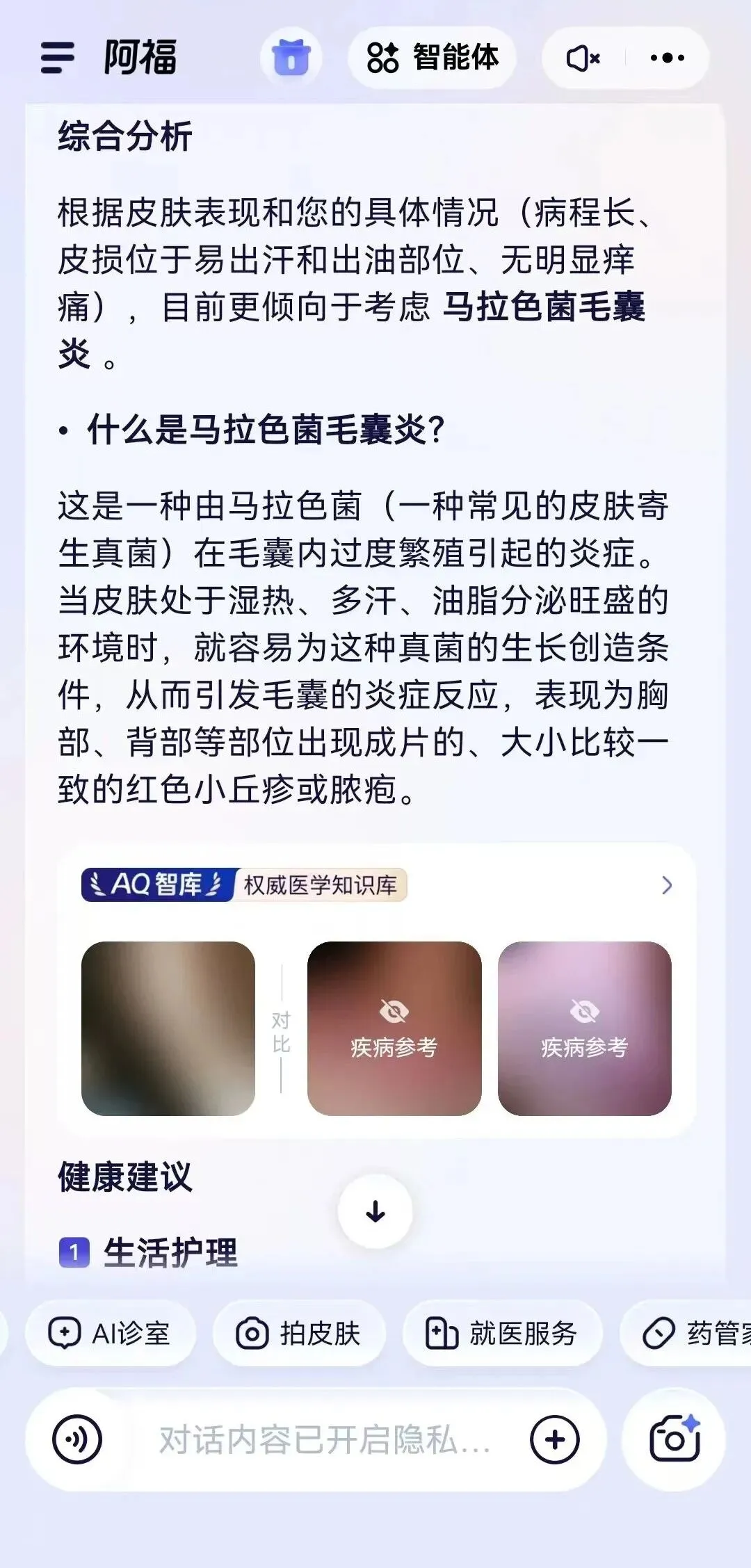 我尝试上传了我家孩子后脖子上正长痘的照片,结果很快AI医生给出了与前阶段去医院就医相同的诊断。这样,一下子提高了我对阿福的信任。