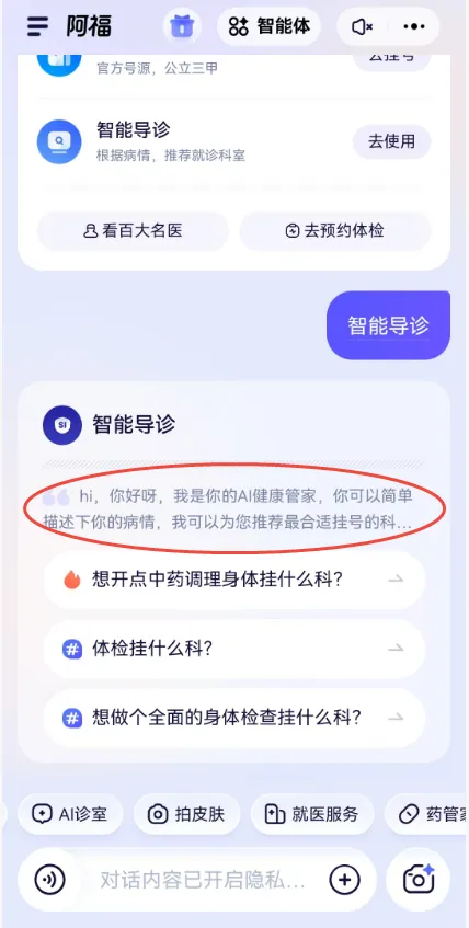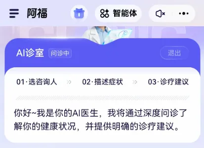 我们来看一下阿福中的智能导诊功能(可实现看百大名医、预约体检)、AI诊室(所有AI问诊的内容由AI生成,仅供参考,持续不适请及时就医)。