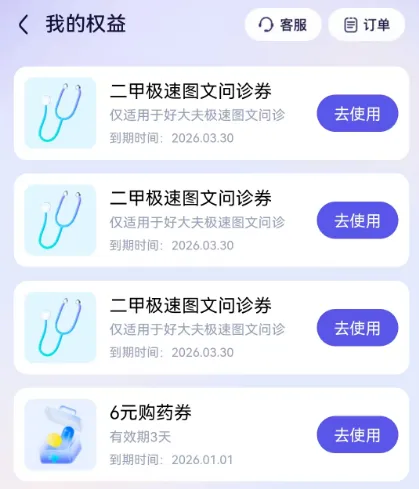 通过任务中心完成各项任务后,可以在我的权益中查看奖品,包括各类二甲急速图文问诊券和购药券。