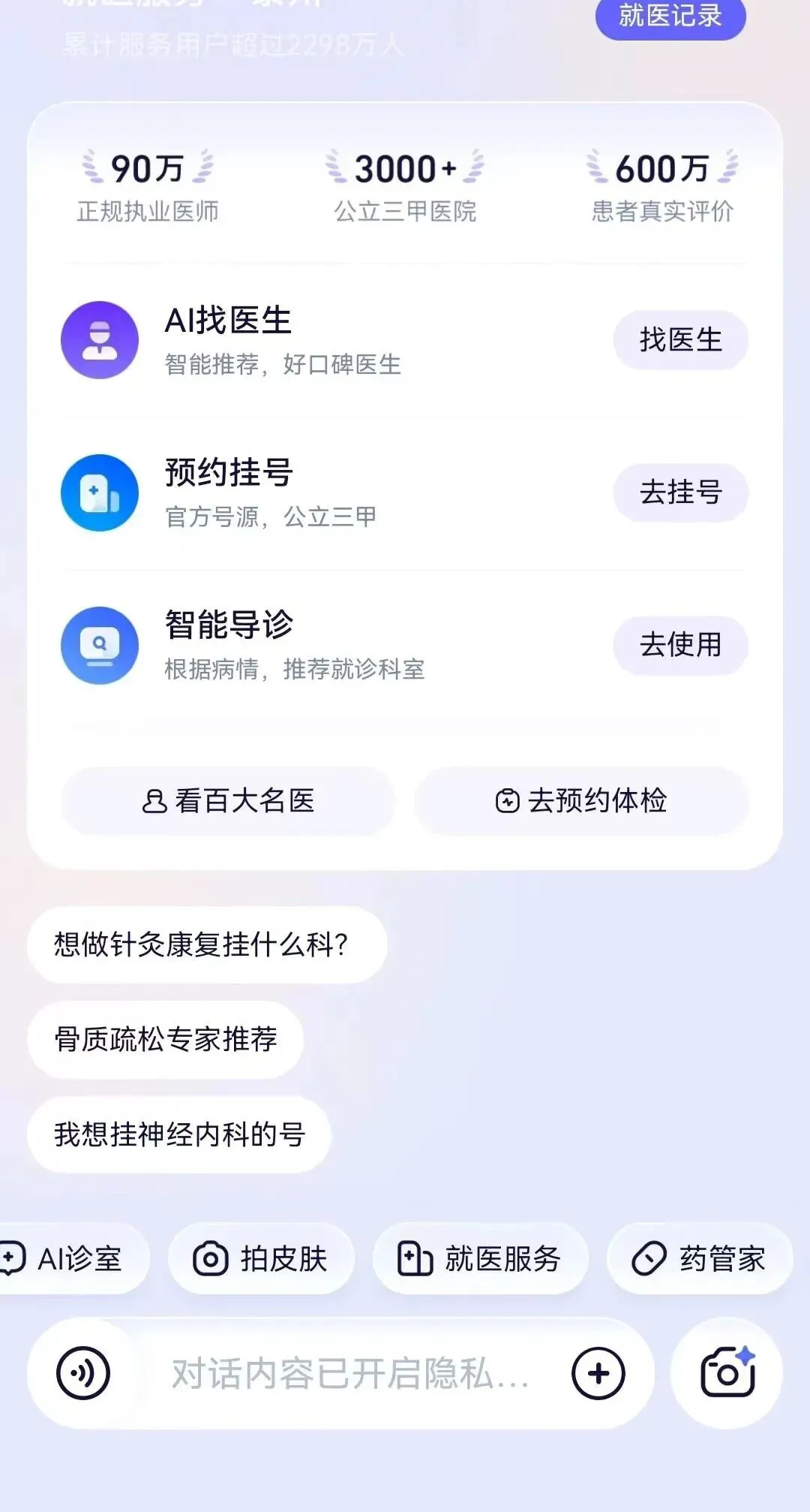 链接全国真人医生及挂号、购药、医保支付等服务,形成 “AI + 医疗资源” 的闭环。