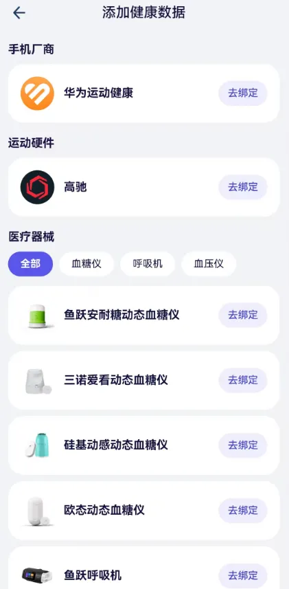 我特地尝试了一下绑定设备的功能,这里可以绑定手机、运动硬件、还有医疗器械,例如血糖仪、呼吸机、血压仪等。绑定后的设备数据,则可以全部在健康仪表盘中展现。