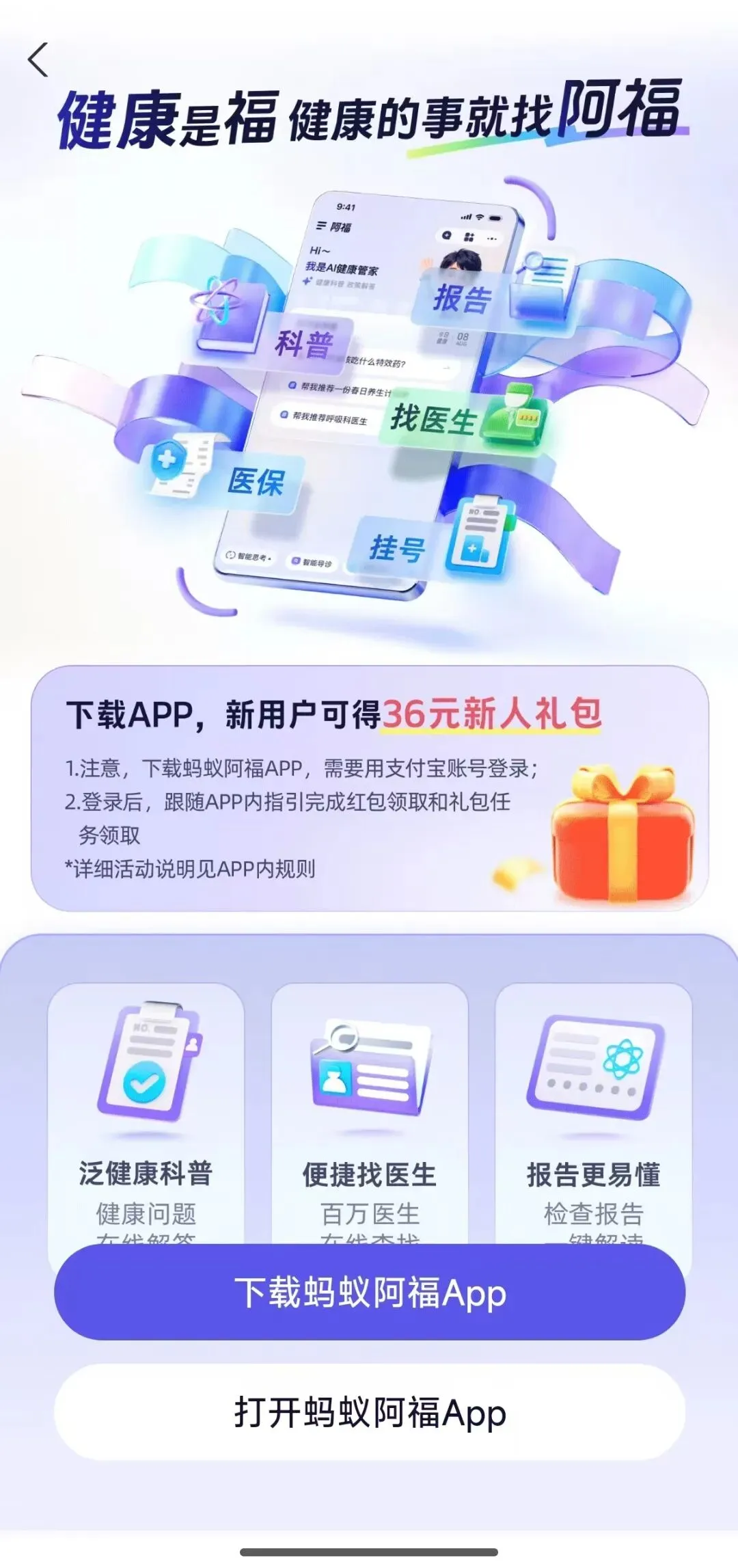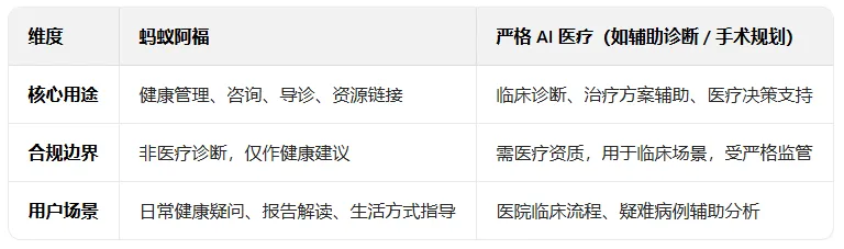 表明蚂蚁阿福属于 AI 医疗健康领域的AI 健康管理应用,更偏向健康管理与医疗资源连接,而非替代临床诊断的 AI 医疗工具。