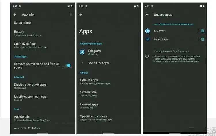 具体来说,就是Android 12会监测应用的使用情况,当一个应用已经长达两个月没有被打开过时,系统首先会自动将该应用切换到“休眠”状态。并且与手动休眠不同的是,此时应用图标并不会被隐藏,但它的运行缓存文件此时已经被完全清理掉,同时也无法后台自启动了。