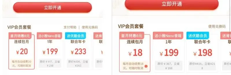 喜马拉雅当前会员套餐定价,左为苹果手机,右为安卓手机