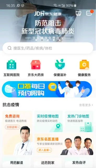 根据官方的介绍,新上线的京东健康APP分为“首页”、“商城”、“我的”三个模块。其中,首页有互联网医院、京东大药房、保健滋补、健康服务四个核心频道入口,并提供“抗击疫情”“寻医问药”“名医直播”“健康资讯”等更多服务场景与内容。