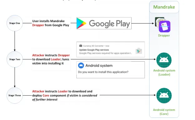 spyware),自2016年起就一直潜伏在安卓后台,这个间谍软件为Mandrake,它能“完全控制手机设备”,窃取信息和加密货币,侵入银行帐户,甚至通过恢复出厂设置来掩盖其踪迹。