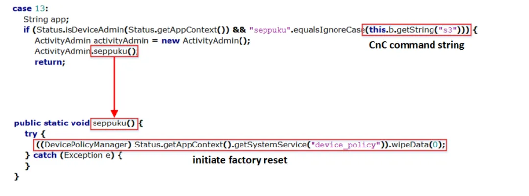“coup de grâce”是内置于名为“seppuku(切腹)”恶意软件中的命令,该命令以一种日本仪式性自杀的形式命名,命令执行后,便将进行返厂级别的设备清洗,从而删除恶意软件的所有痕迹以及所有用户数据。