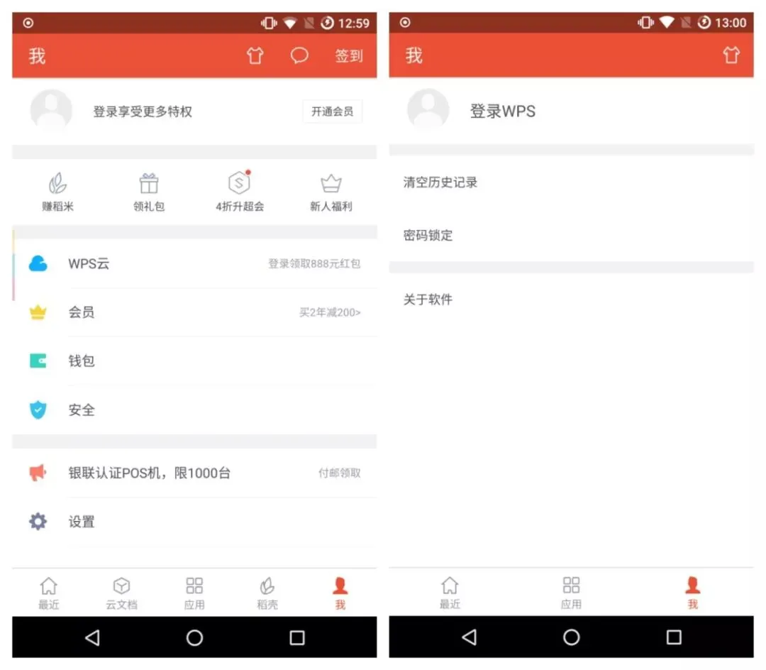 (左:WPS 国内版 ;右:WPS APK Pure 版)