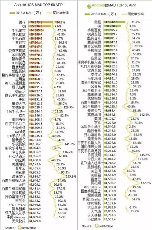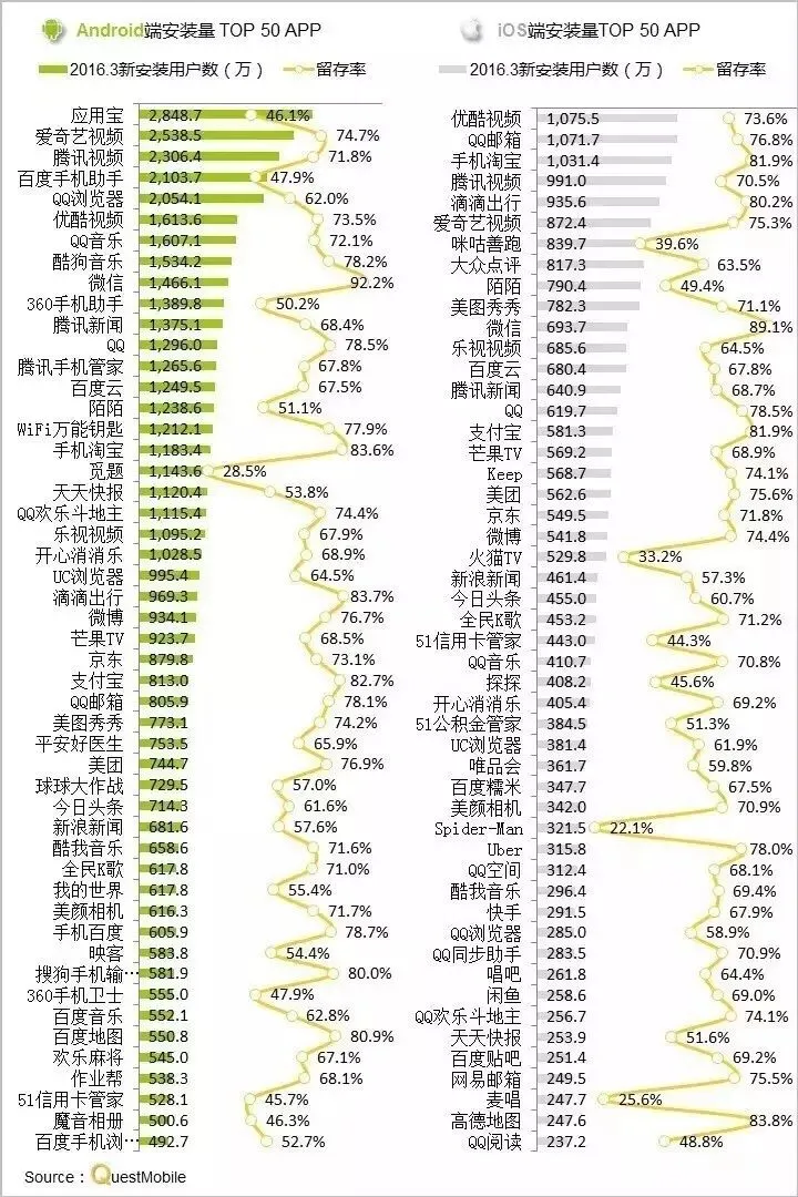 Questmobile3月APP实力榜从Android、iOS两大系统平台的APP月度活跃用户数、日均活跃用户数、使用总时长、人均时长、新安装用户数等多个维度进行分析,同时,通过对各指标维度TOP50应用的展现,揭示2016年移动互联网行业的发展状况与趋势。