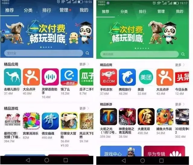 同期,各大手机厂商都基于原生Android开发了自家的定制化“ROM”,纷纷推广自家应用市场,比如2014年,“智汇云”正式更名为“华为应用市场”,借助于庞大的用户数量、良好的用户体验、天然入口的优势以及至上的用户服务理念,形成强劲的用户拓展能力,作为华为终端的官方应用下载平台,华为应用市场顺理成章地进入到应用分发市场的前列,直接与第三方应用市场等其他平台展开竞争,成为应用分发市场的重要组成部分。