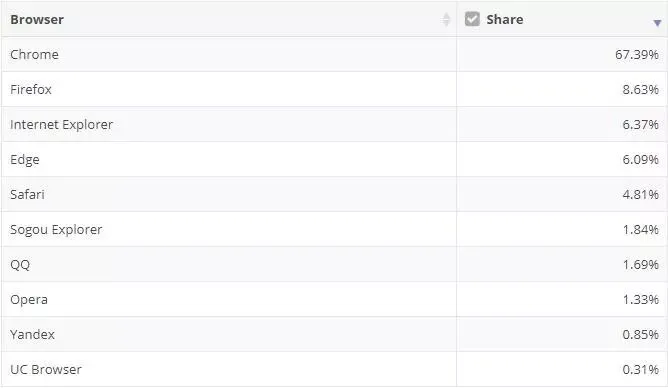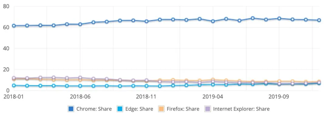 要说原因也很简单,咱们先看看刚刚公布的,2019 年全球浏览器市场份额。