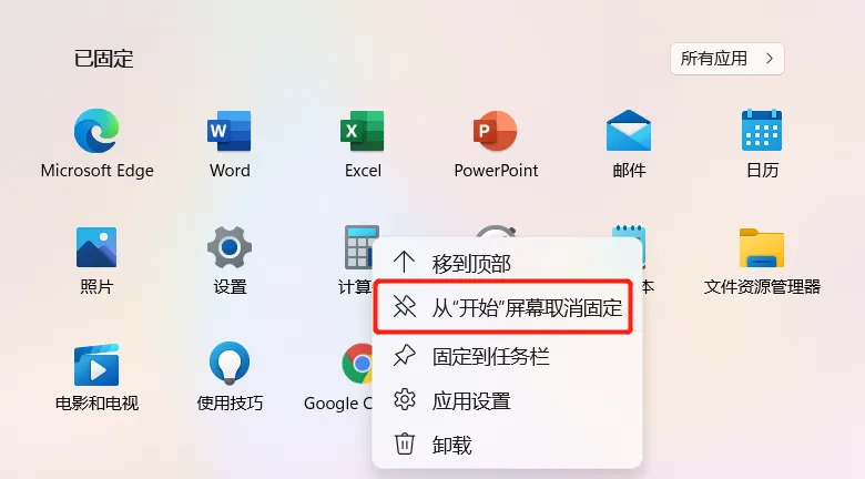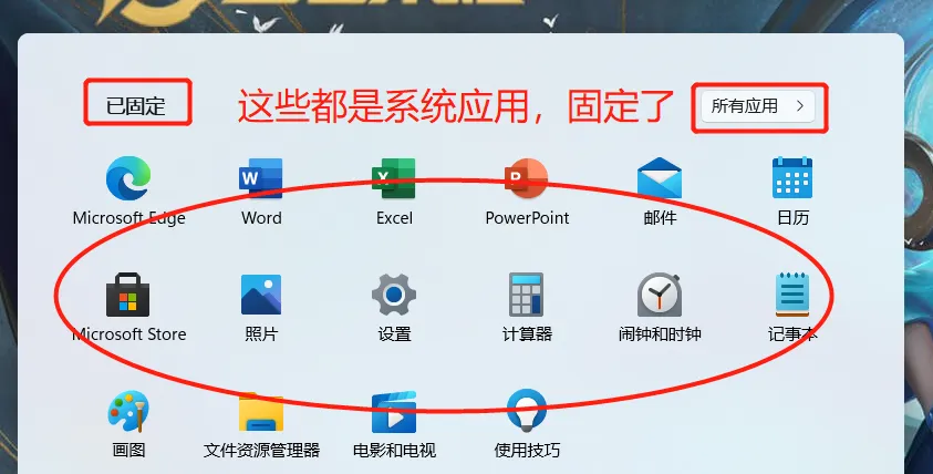 系统应用可以取消,腾出来位置后,之前固定的应用就可以显示在开始菜单了。