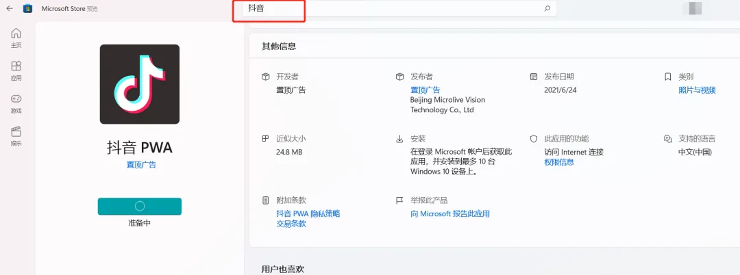 比如,你打开微软应用商店,直接搜索抖音,就能下载。