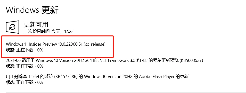 最后,回到Windows更新,进行检查更新,就会发现Windows 11 的预览版本已经出现在更新中了。