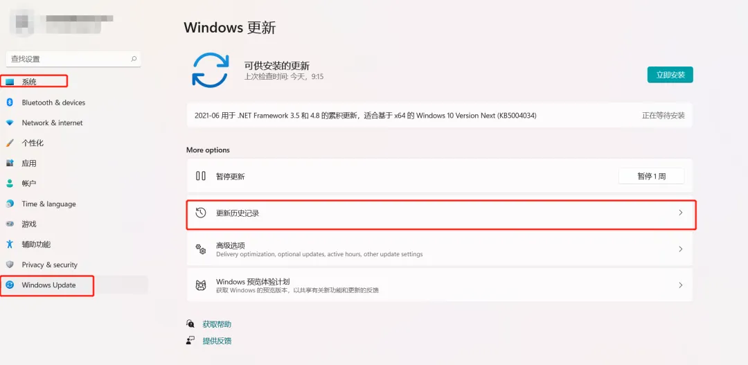 系统→Windows Update,选择更新历史记录。
