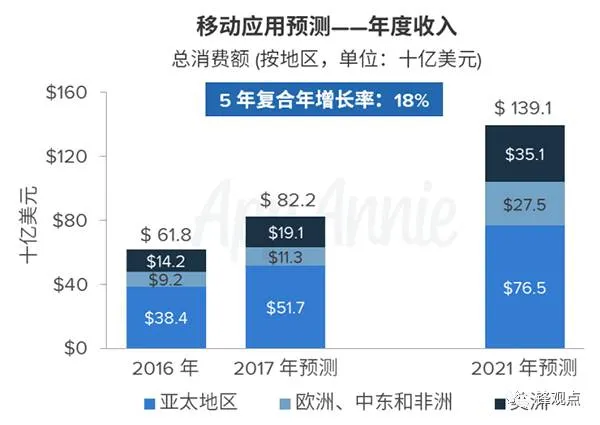 App Annie 根据现在的应用市场环境,非常看好未来几年的应用生态营收,预计在 2021 年全球应用商店平台总消费额将会超过 1390 亿美元,其中人口众多的亚太地区更加会占据总营收的大部分。