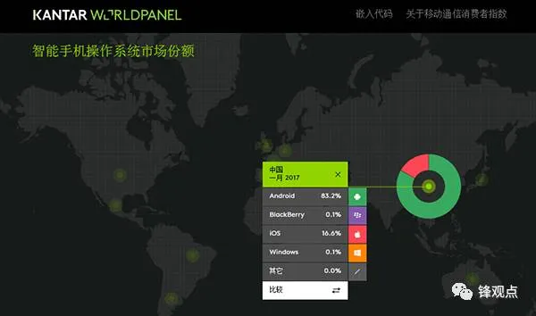这个数据并不是空穴来风,就以国内来说,另一家调查机构 Kantar 最新的统计数据报告显示,2017 年中国一月份的智能手机系统统计数据中,安卓系统在中国基本占据了统治地位,达到了 83.7%,比起上年同期的 73.9% 增长约为 10%。同时,iOS 份额则跌至 16.6%。