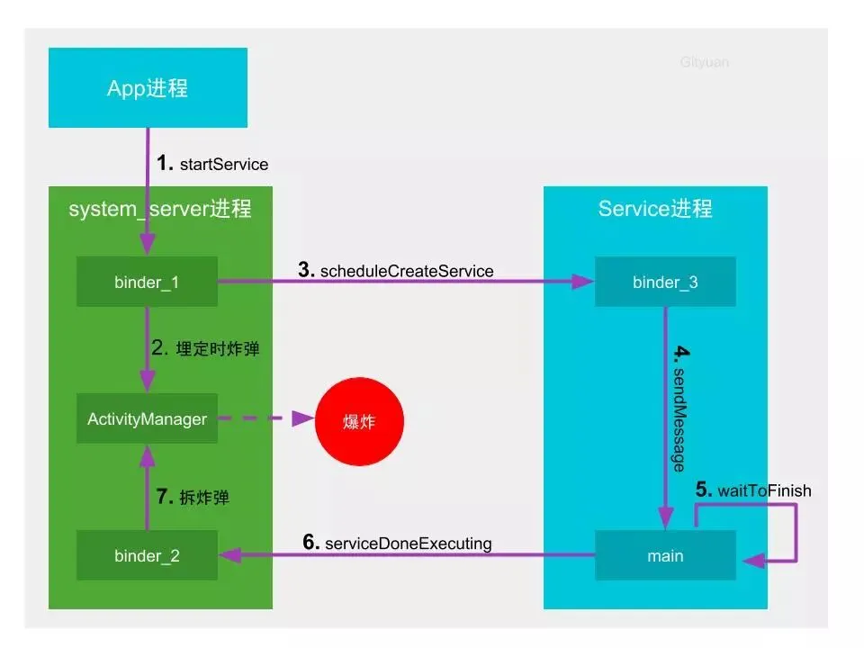 埋定时炸弹:中控系统(system_server进程)启动倒计时,在规定时间内如果目标(应用进程)没有干完所有的活,则中控系统会定向炸毁(杀进程)目标。