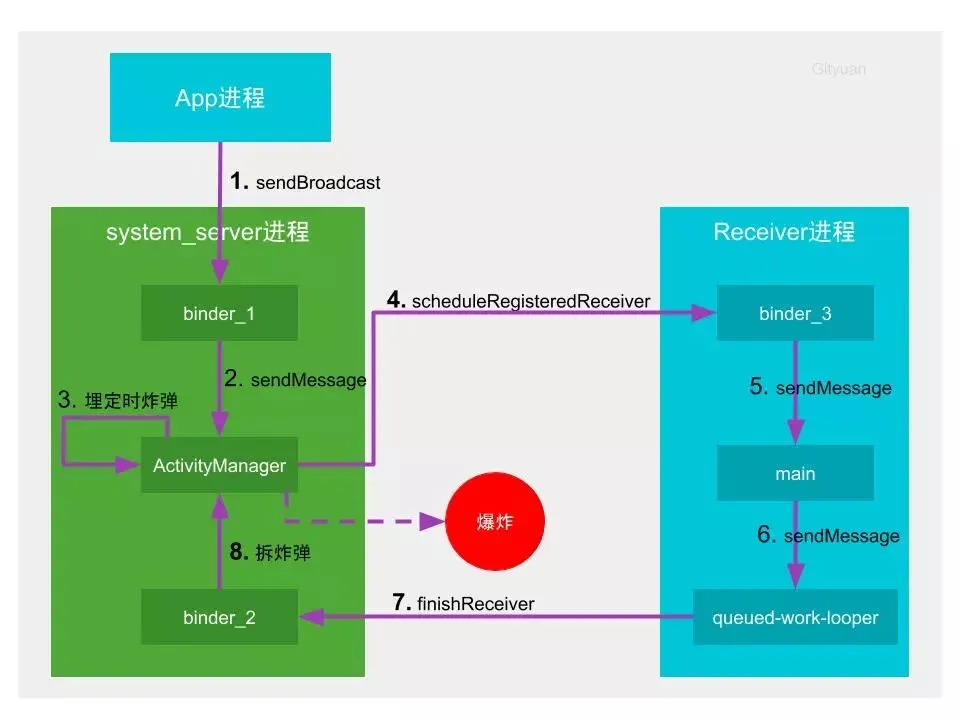 中控系统的通信员2号接收到该信息后,向组件管家(ActivityManager线程)发送消息,埋下炸弹