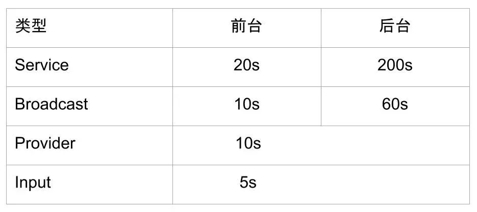 不同组件的超时阈值各有不同,关于service、broadcast、contentprovider以及input的超时阈值如下表:
