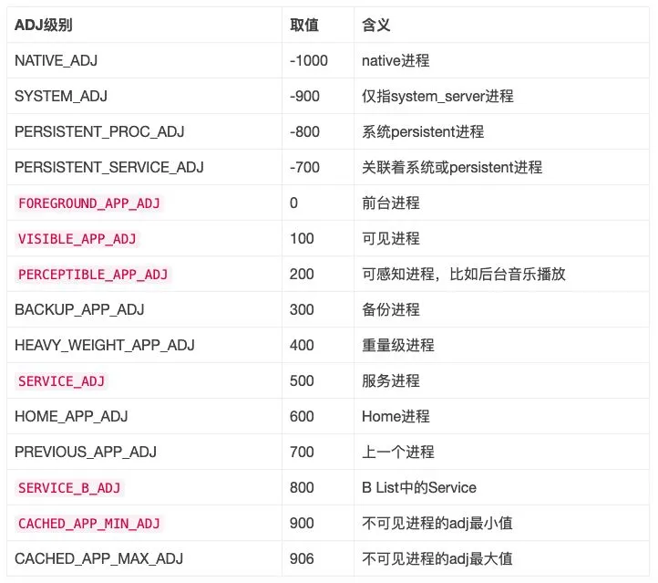 什么进程属于SCHEDGROUPBACKGROUND调度组呢?进程调度组大体可分为TOP、前台、后台,进程优先级(Adj)和进程调度组(SCHED_GROUP)算法较为复杂,其对应关系可粗略理解为Adj等于0的进程属于Top进程组,Adj等于100或者200的进程属于前台进程组,Adj大于200的进程属于后台进程组。关于Adj的含义见下表,简单来说就是Adj>200的进程对用户来说基本是无感知,主要是做一些后台工作,故后台服务拥有更长的超时阈值,同时后台服务属于后台进程调度组,相比前台服务属于前台进程调度组,分配更少的CPU时间片。