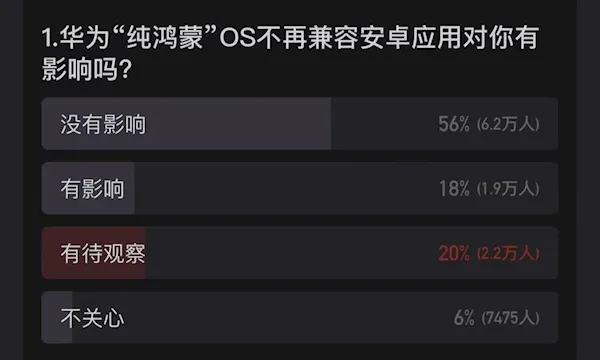 针对此变化,@凤凰网科技 发布了一则调查,有近20万网友参与。调查结果显示,有超半数网友认为,华为“纯鸿蒙”系统不再兼容安卓应用,对自己并无影响。20%的网友选择“有待观察”,18%的网友认为“有影响”。