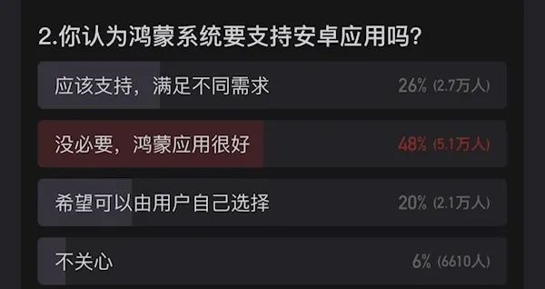对于鸿蒙系统是否要支持安卓应用这一问题,近半数网友认为“没必要,鸿蒙应用很好”,26%的网友认为“应该支持,满足不同用户需求”,20%的网友认为“希望可以由用户自己选择”。