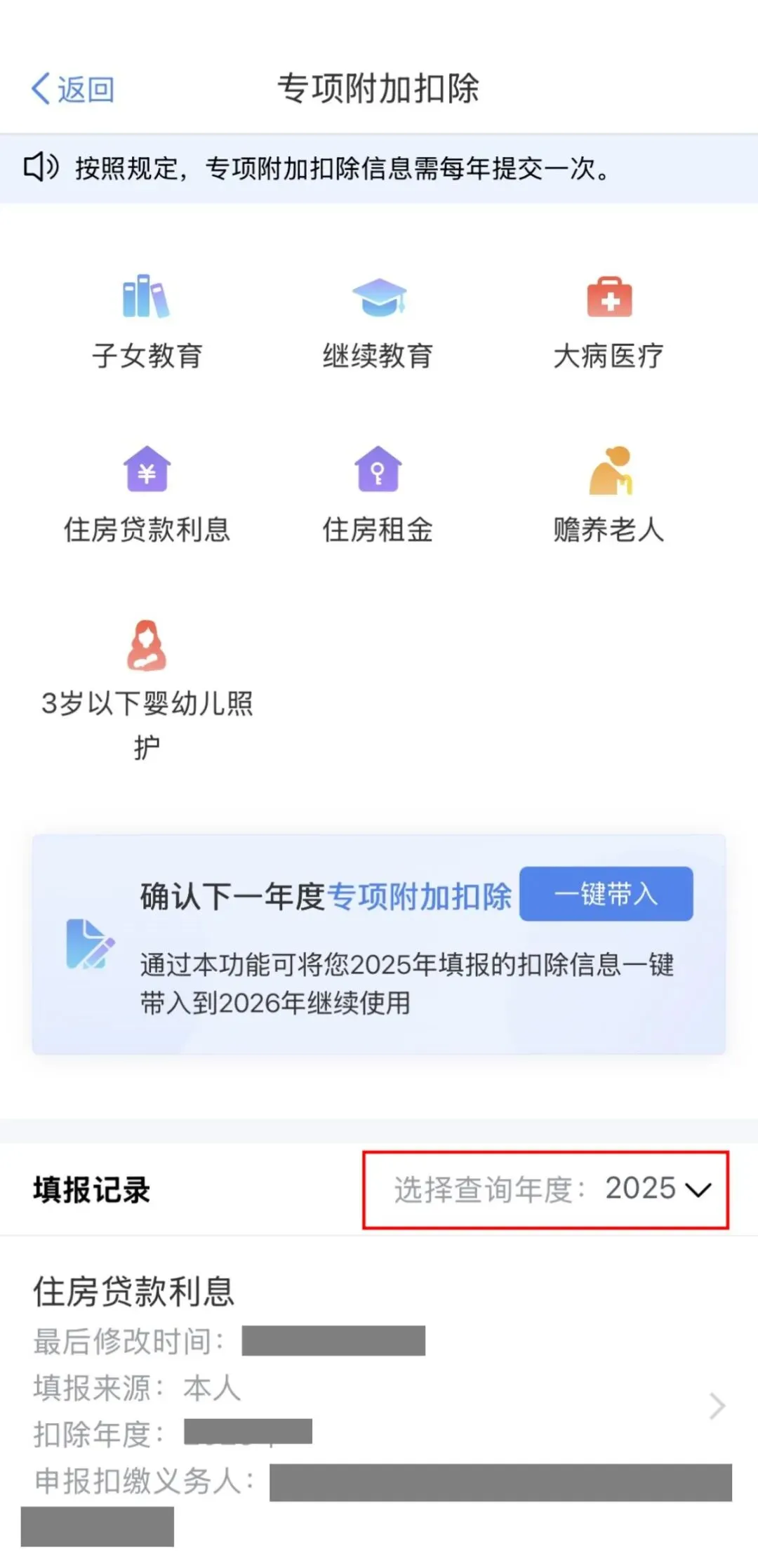 2026年度个人所得税专项附加扣除信息自12月1日启动确认,纳税人通过个人所得税App与自然人电子税务局Web端即可实现“一键带入”。 在办理的过程中有纳税人朋友发现,在确认住房贷款利息扣除时,系统提示“贷款合同编号跟以前年度不一致”,这该怎么处理呢? ![]() 别着急,可能有以下三种情况。 填写的是同一套住房,且贷款合同编号未发生变化 请仔细检查系统提示不一致的年度中贷款合同编号是否完全一致。查看是否有中英文括号格式、短横线等符号格式错误,如有,请修改对应年度的合同编号。 ● 若只是某一年度填报错误其他年度均正确的,可以在填报错误的年度的填报详情页面点击【修改】-【修改贷款信息】-【贷款合同编号】-【确认修改】; ![]() ![]() ![]() (点击查看大图) ● 若有两个(含)以上的年度填报存在错误,需要将填报错误的记录作废重填。 填写的是同一套住房,但贷款合同编号发生变更 如您属于首套住房贷款,但因为存量住房贷款置换、“商转公”等原因,使得同一套住房下的贷款合同信息发生变化。可根据系统提示,在【补充证明材料】界面中【贷款合同是否发生变化】选择“是”后,选择适用的变更类型,并上传相关佐证材料。 ![]() ![]() (点击查看大图) 填写的是不同套住房 根据政策规定,纳税人只能享受一次首套住房贷款利息专项附加扣除。也就是说,即使您的不同套住房,银行均是按照首套房贷款利率发放贷款,您也只能保留其中一套住房的住房贷款利息专项附加扣除,须作废其他套住房的专项附加扣除信息。 如作废、修改专项附加扣除信息影响到您年度汇算结果,请及时办理或更正相应年度综合所得年度汇算。 “一键带入”功能 将在2025年12月31日截止, 请需要办理的纳税人 及时通过个人所得税App 或自然人电子税务局Web端 进行信息确认哦! |