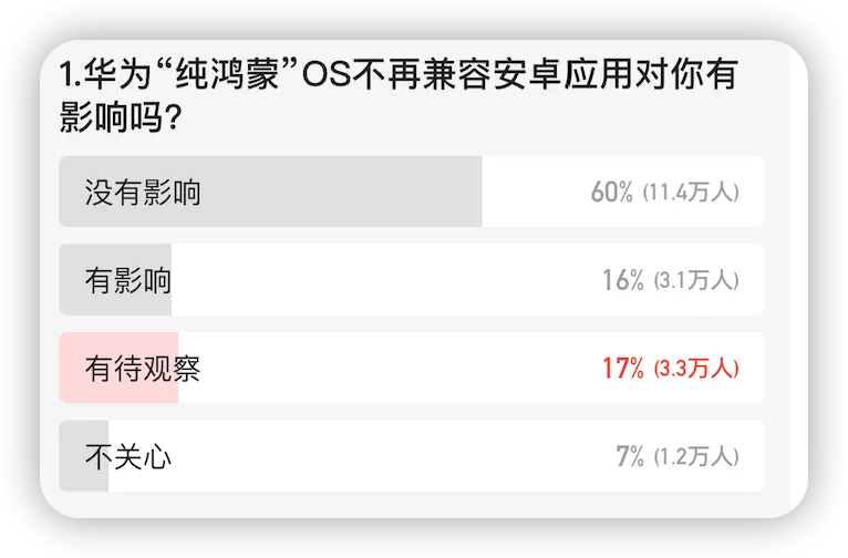 调查结果显示,60% 的网友认为,华为「纯鸿蒙」系统不再兼容安卓应用,对自己没有影响。