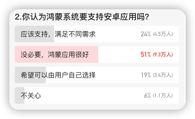 有超过半数的网友,认为「没有必要支持安卓应用,鸿蒙应用很好」。