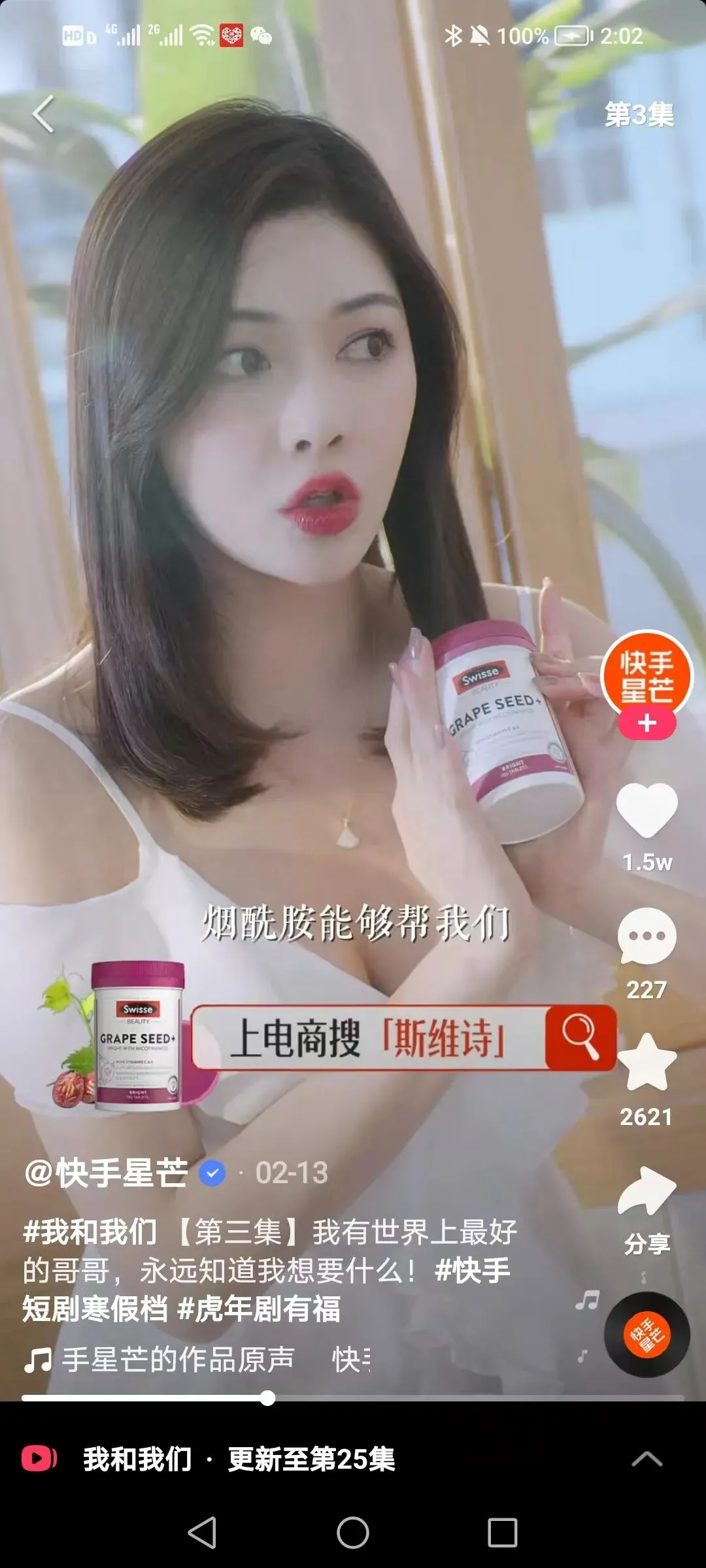 比如Swisse作为《我和我们》短剧的独家冠名商,就在短剧中深度植入了广告。除了密集曝光,女主作为影后,在剧中专门有一集推荐品牌的葡萄籽烟酰胺片,并且剧场内点击可直接跳转到电商,实现内容—种草—消费的闭环。