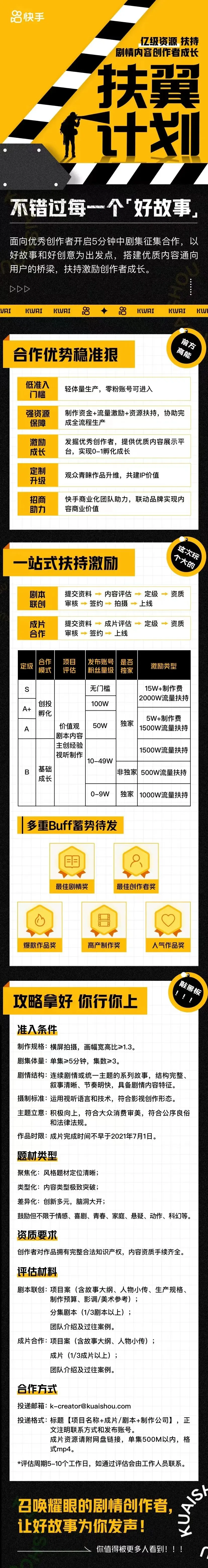 在短剧扶持方面,去年10月快手短剧新增了S+档位,成本定在5万/分钟,快手平台参投40%,且分账不做扣除。