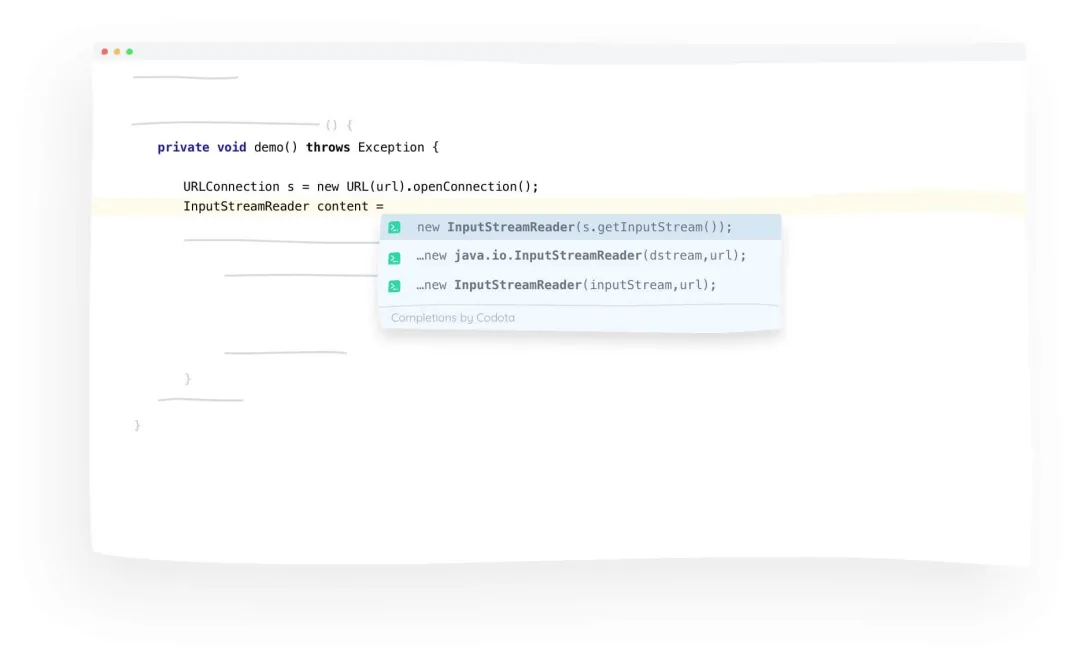这个插件用于智能代码补全,它基于数百万 Java 程序,能够根据程序上下文提示补全代码,相比于 IDEA 自带的智能提示来说,Codota 的提示更加全面一些,如下图所示: