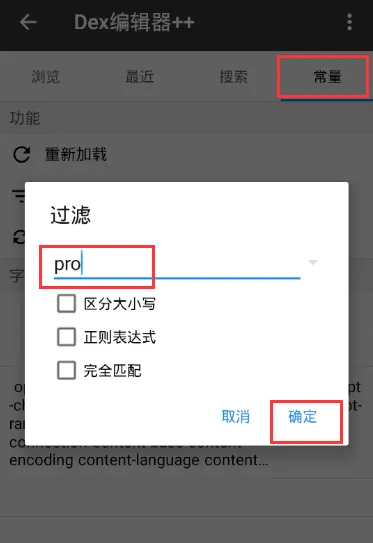 那这里,我们在打开的dex++最右边【常量】中过滤关键词:Pro;搜索到很多,没关系,我们往下翻看看;