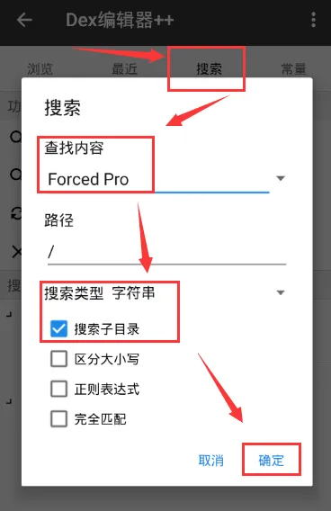 6、复制完Forced Pro文本,我们选择顶部功能【搜索】,粘贴文本,选择搜索类型【字符串】,勾选【搜索子目录】,然后确定;