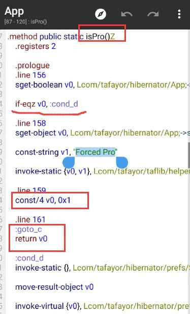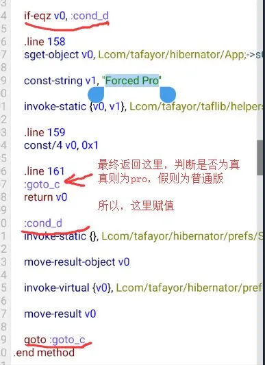上述代码中if-eqz v0, :cond_0(如果等于v0,则跳转至cond_0),而最终goto :goto_0,return v0。即返回至v0,读取其值,const/4 v0, 0x1:1为真,0为假。这里可说为,赋值v0值为1,则为pro,反之为普通。