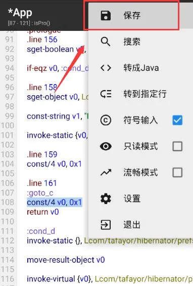 而我们就是在这里赋值实现其返回为真,即PRO。所以,我们在:goto_0下面赋值const/4 v0, 0x1,如下图,保存返回,签名打包。破解成功!