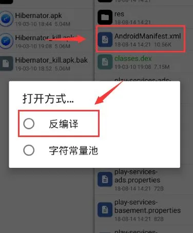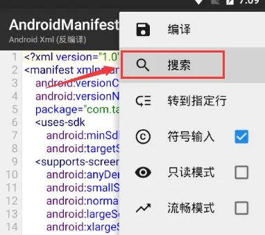 点击Androidmanifiest.xml;选择【反编译】;