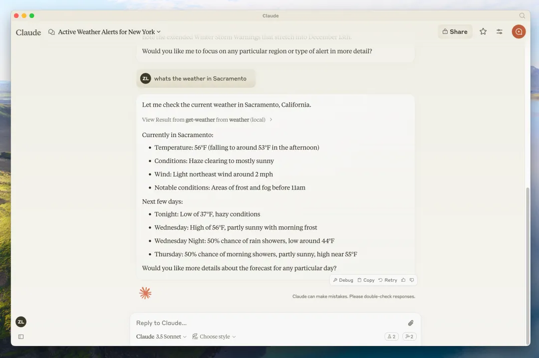 图5:Claude Desktop通过MCP连接天气服务器,实时获取预报信息