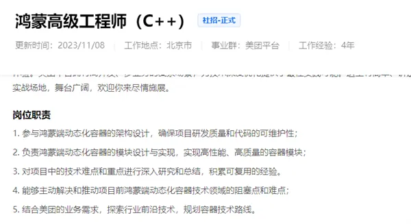 其中一个工作地点在北京的“鸿蒙高级工程师(C++)”岗位就是面向的美团鸿蒙App研发团队,根据描述其岗位职责主要包括: