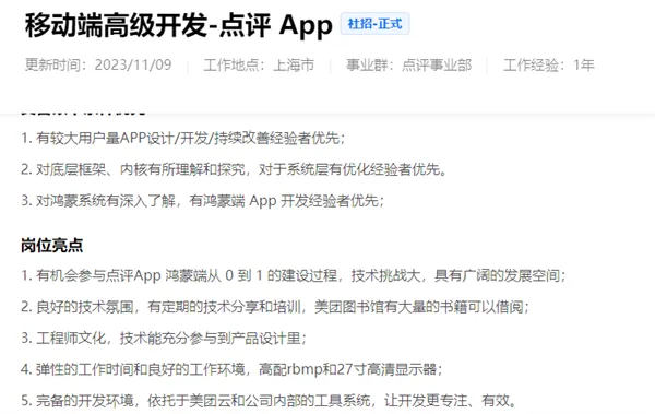 此外还有一个工作地点在上海的“移动端高级开发-点评App”,在岗位亮点中直接写了有机会参与点评App鸿蒙端从0到1的建设过程。