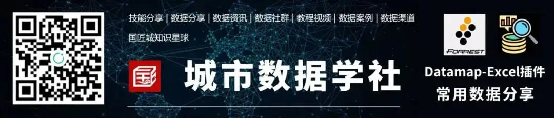 欢迎加入城市数据学社知识星球,一起探讨城市数据与应用,一起分享学习数据技能。城市数据学社关注GIS、Python、大数据、新技术等领域,近期加入即赠送Excel分析插件Datamap最新版(一年使用权限),长按以下二维码识别可以加入。