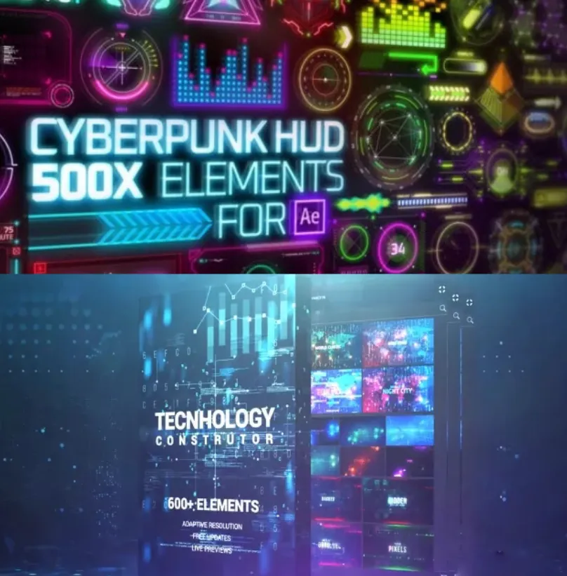 这套预设包提供了523个HUD科技感赛博朋克霓虹发光UI元素图形动画:三角形、圆形、相机界面、三维图形、错误警告提示、频谱、箭头、地图、线框、网格、线条、图标等;