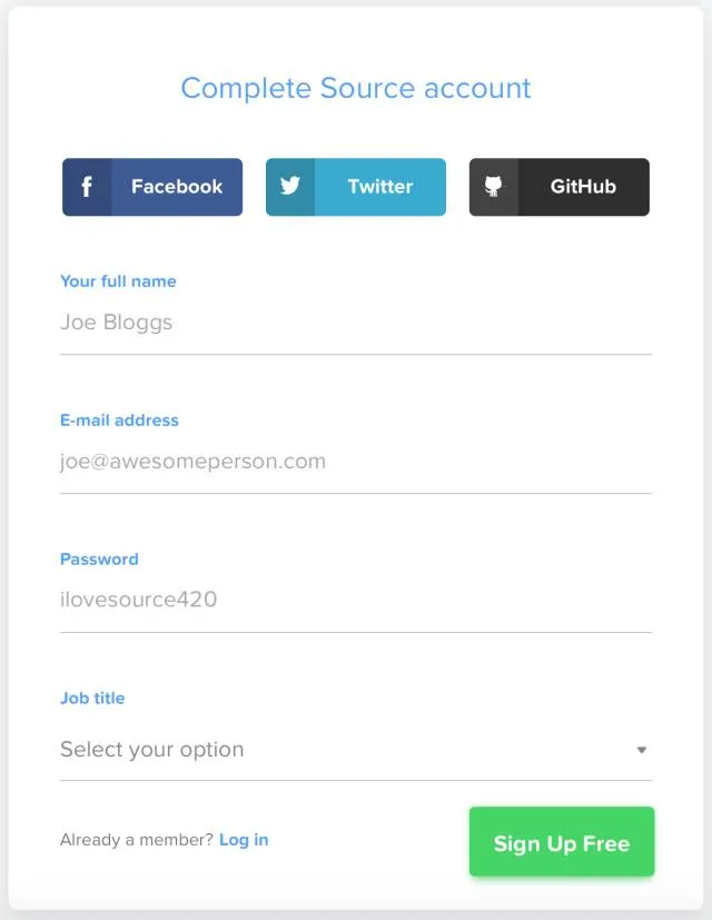 4、来到Source网站的登陆页面,可以选择使用 Facebook、Twitter、GitHub 账号直接登入(需科学上网),或者输入姓名、Email 和密码来免费注册,登入后点击授权按钮完成认证: