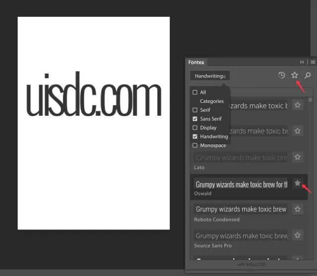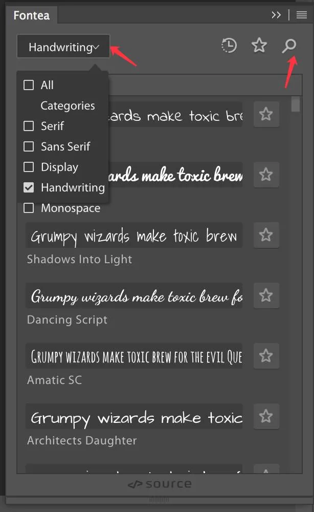 6、点击左上角的筛选器还可以筛选衬线、无衬线、手绘字体等,还可点击搜索按钮手动查找字体: