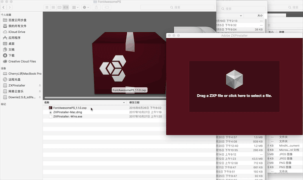 1、根据自己电脑系统选择ZXP安装包,双击打开,然后把FontAwesomePS安装程序拖入ZXP窗口: