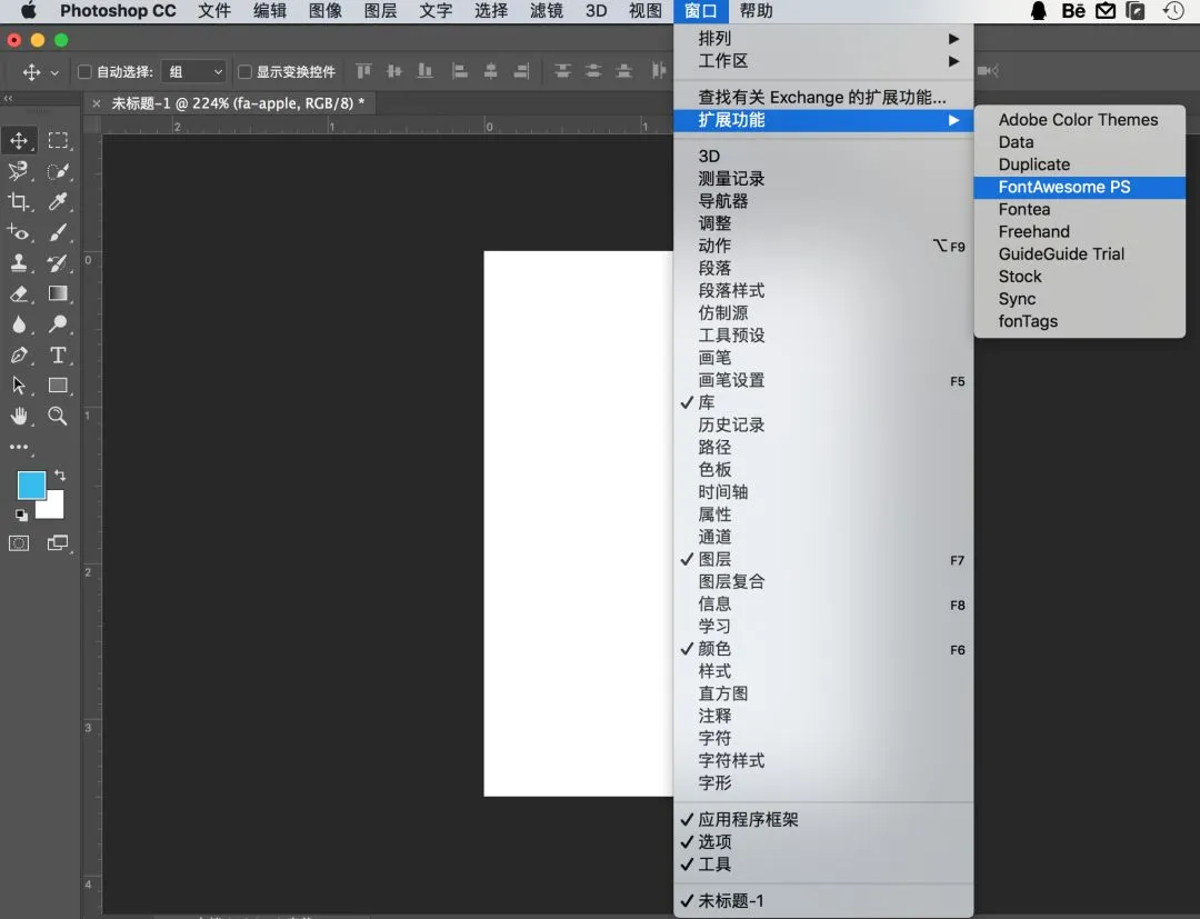 2、安装完成,打开Photoshop,在窗口下的扩展功能里找到FontAwesomePS: