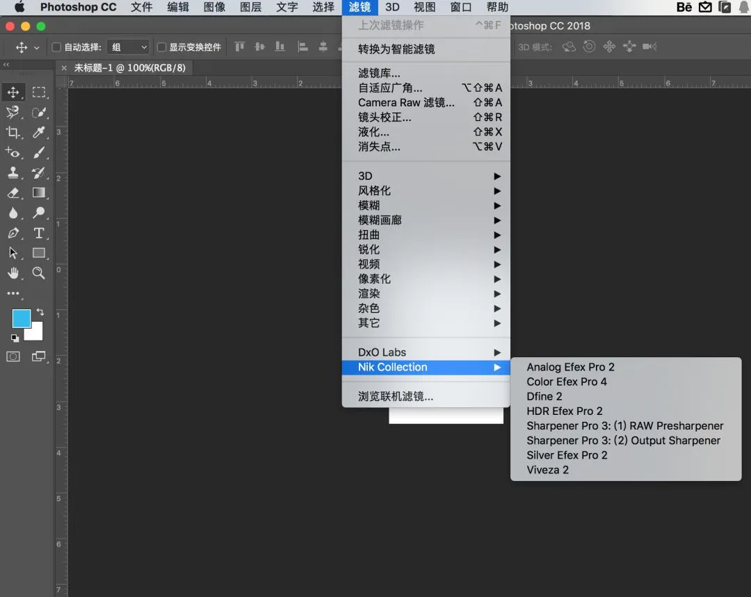 3、打开Photoshop,可以在滤镜下找到Nik Collection的6款插件,或者直接在Nik Collection的悬浮窗口里点击使用: